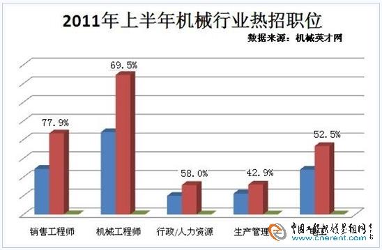 在招聘職位方面,銷售工程師這一招聘榜上的“常青樹”又一次摘得“2011年上半年機(jī)械行業(yè)最熱招職位”的第一名。除此之外,機(jī)械工程師、行政/人力資源、電工/磨工/銑工、生產(chǎn)管理與銷售工程師一起,成為了“2011年上半年機(jī)械行業(yè)最熱招職位”的前五強(qiáng)。